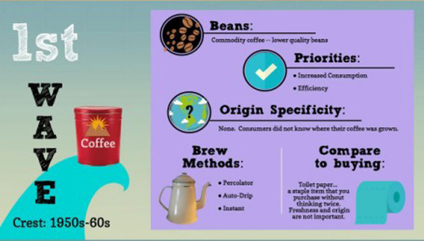 Το 1ο κύμα ήταν η μαζική παραγωγή και η παγκοσμιοποίηση του καφέ, η εποχή που ο καφές εξαπλώθηκε ραγδαία.